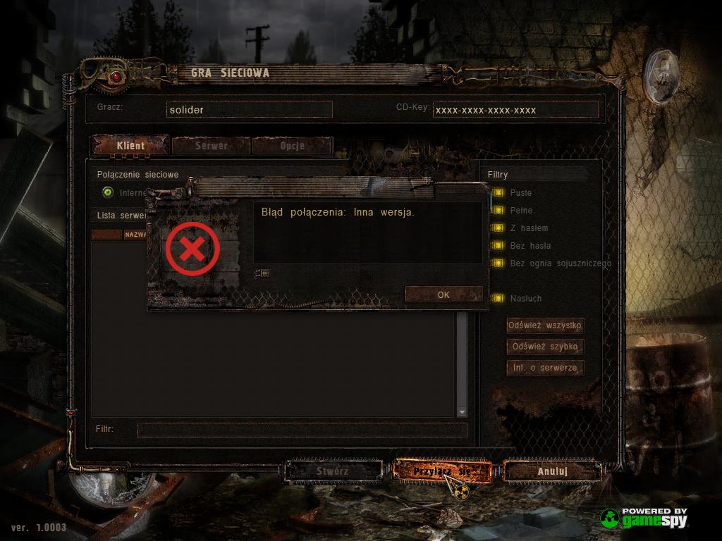 Też mam problem z multi pomimo iż chcę się dołączyć do serwera z ta samą wersją gry. Zastanawiam sie zatem czy to może byc wina moda/-ów gdyż też mam ustawiony pełny dostęp dla S.T.A.L.K.E.R'a. Zamieszczam fotke z błędem (widać na nim wersje gry jaką posiadam)